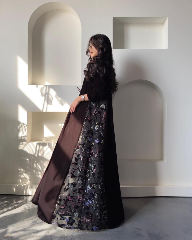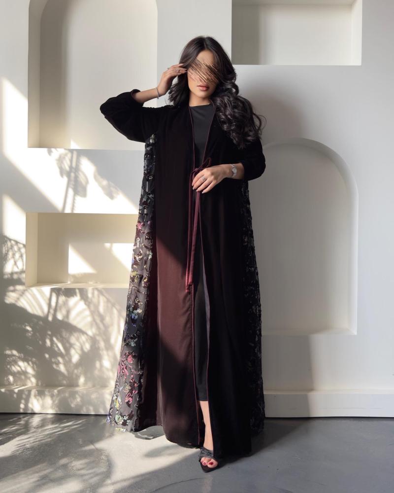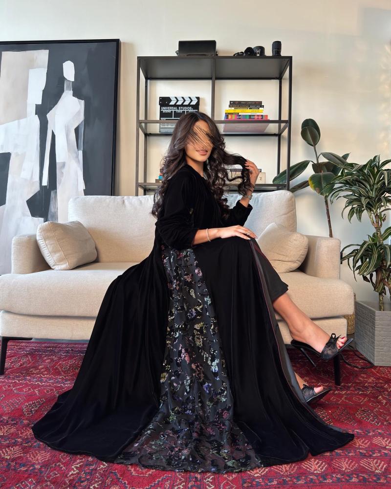 القماش مخمل اسود بتدخيلة تُل برسومات مخمل ملونه وطرف باللون العنابي من الامام والاكمام القصة نص كلوش + طرحة اسود